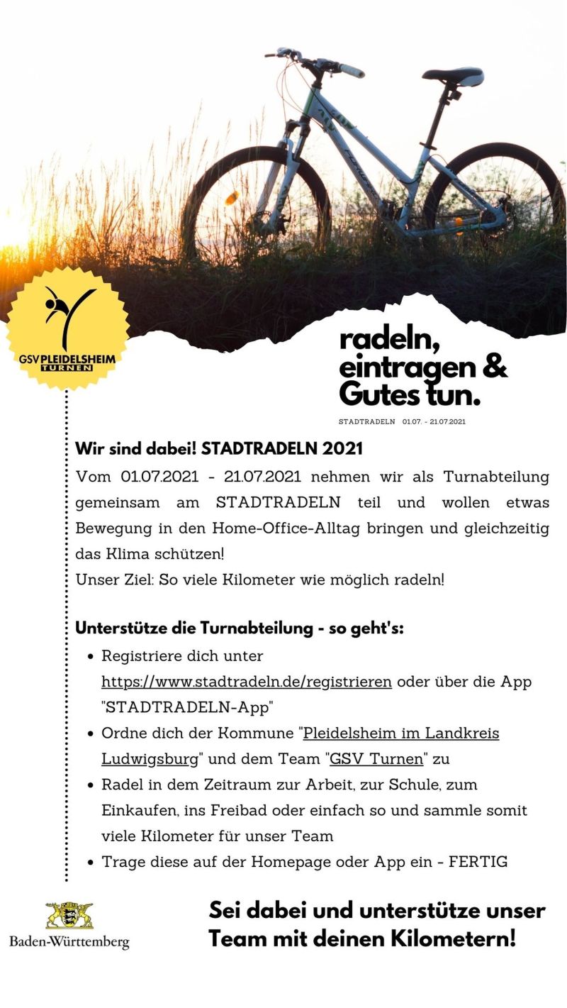 Vom 01.07.2021 – 21.07.2021 schwingt sich Pleidelsheim aufs Rad – das diesjährige STADTRADELN findet statt. Gemeinsam wollen wir so viele Kilometer wie möglich fahren und so etwas für unsere Gesundheit und Umwelt tun.