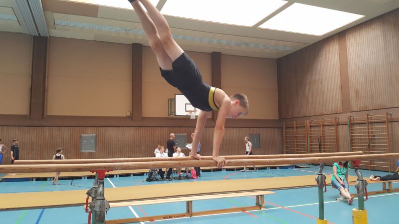 Als erster Programmpunkt für den Samstag stand die Teilnahme am Wahlwettkampf an. Hierbei konnte sich jeder Teilnehmer drei Disziplinen aus den Bereichen Gerätturnen, Leichtathletik, Trampolin und Schwimmen aussuchen. Wir starteten hierbei am Sprung. Somit waren Oscar Heinrich und Nick Wolfangel die ersten, die ihr Können unter Beweis stellen durften. Beiden gelang ein guter Start in den Wettkampf. Danach mussten wir am Minitrampolin eine Weile warten, da sich hier viele anderen Vereine ebenfalls angemeldet hatten. Um die Wartezeit zu überbrücken turnte Vincent Maier solange am Reck. Er turnte erstmalig an einem Wettkampf am Spannreck, das mit 2,60m ab der Mattenoberkante doch eine beeindruckende Höhe aufweist. Jetzt waren wir auch am Trampolin endlich an der Reihe und Lars Wahl, Michel Irro sowie Nick und Oscar konnten alle ihren Salto gebückt zeigen. Trotz dem ein oder anderen kleineren Wackler bei den Landungen konnten alle vier Jungs auch hier gute Ergebnisse erreichen. Es folgten im Anschluss Boden und Barren, danach waren mit Nick, Oscar und Michel drei unserer fünf Teilnehmer mit ihrem Wettkampf fertig und konnten sich nun ganz auf das Anfeuern von Lars und Vincent beim Sprinten auf 50m bzw. 75m konzentrieren. Nach dem Abstecher in das Stadion hatten alle Teilnehmer ihren Wettkampf nach ca. zwei Stunden geschafft und waren nun gespannt auf die Ergebnisse, die es jedoch erst am nächsten Tag geben sollte.