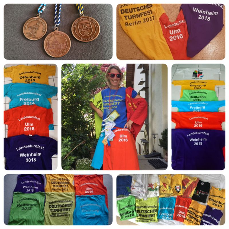 Sonntag, 24.05.2020 - T-Shirt Challenge: Der Schwäbische Turnerbund besteht aus mehreren Turngauen. Das sind meist Zusammenschlüsse beieinanderliegender Dörfer und Städte. Der Turngau Neckar-Enz, dem Pleidelsheim angehört, erstellt zu jedem Turnfest ein T-Shirt. Sehr schön kommen diese zur Geltung, wenn immer am letzten Tag der große Umzug stattfindet und alle aus dem Turngau im gleichen T-Shirt zu sehen sind. Passend zu dem eigentlich stattfindenden Umzug war es die Aufgabe, ein Bild von allen Turnfest-T-Shirts zu machen, die man bereits sammeln konnte. Tatsächlich hatte Anke Kreutzer die meisten T-Shirts (14) zu Hause, gefolgt von Ulla Sirch (10) und Katja Leibfritz (9). Der Preis für die kreativste Umsetzung geht an Susanne Hammer: sie setzte ihre T-Shirts ganz besonders toll in Szene.
