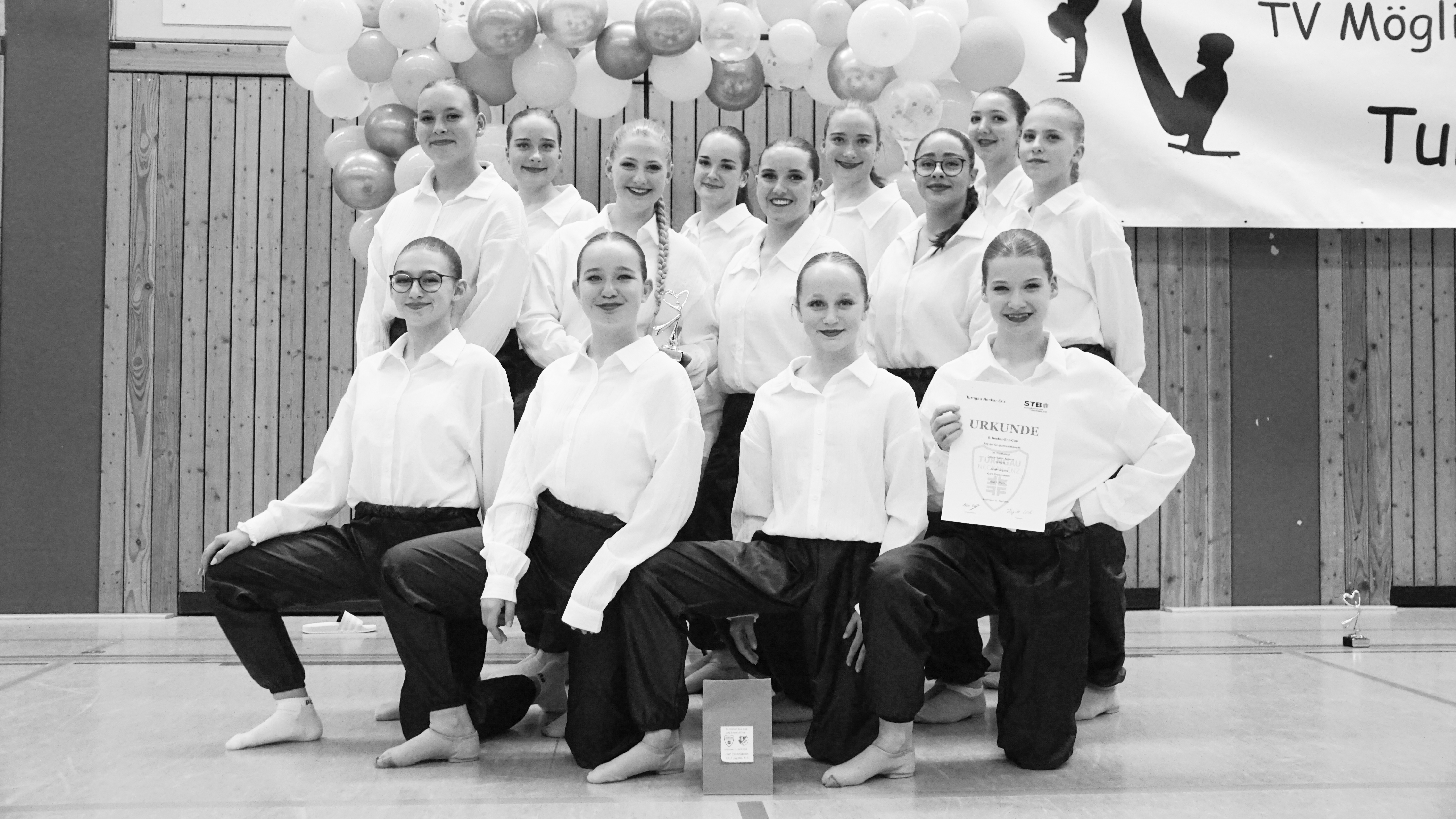 Weiter gings in der Kategorie Dance Basic Jugend. Hier nahmen auch 2 Gruppen vom GSV Pleidelsheim teil. Vor der Pause durften die jüngeren, die JustP Tweens ihren Matrosentanz dem Publikum und Kampfgericht präsentieren. Sie starteten dieses Jahr das erste Mal in der Kategorie Jugend mit Trainerin Lisa. 13 Mädels im Alter von 11 bis 12 Jahren tanzten auf einen Remix der Lieder „Drunken Sailor“ und „Wellerman“ und entführten uns auf eine lustige Seefahrt über die Weltmeere. Schiff Ahoi! Sie belegten mit 9,10 Punkten einen super 5. Platz. Eure Trainerin ist sehr stolz auf euch! Nach der Pause ging es dann für die JustP Jugend an den Start. Im Alter von 12 bis 16 Jahren tanzten sie auf das Lied „Einer für Alle“ aus dem Musical „Die drei Musketiere“. Mit viel Mut, Stärke und Zusammenhalt zeigten sie, was man alles erreichen kann, wenn man viel trainiert, an sich glaubt und vor allem treu und fest, Seite an Seite füreinander da ist. Die 13 Tänzerinnen tanzen erst seit dieser Saison gemeinsam unter der Leitung des JustP Trainer Teams und machten uns daher besonders stolz, dass teilweise sogar ein paar Tränchen verdrückt wurden. Absolut verdient erreichten sie mit 11,80 Punkten den 2. Platz!